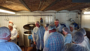 Inzwischen hatte sich auch die Sonne gegen den Nebel durchgesetzt und so ging die Fahrt weiter zu einer Gaststätte. Nach dem Mittagessen fuhren wir ein kurzes Stück bis nach Gospoldshofen. Dort erwartete uns bereits der Chef der Käserei Vogler. Vor der Besichtigung durften sich alle mit aparten Umhängen und Kopfbedeckungen schmücken, die aus Hygienegründen jeder Besucher zu tragen hatte. Während Herr Vogler uns den Herstellungsprozess des Käse erläuterte, hatte er immer einen lockeren Spruch auf den Lippen, der für viel Heiterkeit sorgte. Natürlich konnten wir anschließend auch Käse probieren und einkaufen, der dann jedoch aus Geruchsgründen die Weiterfahrt im Gepäckbereich des Busses verbringen musste.